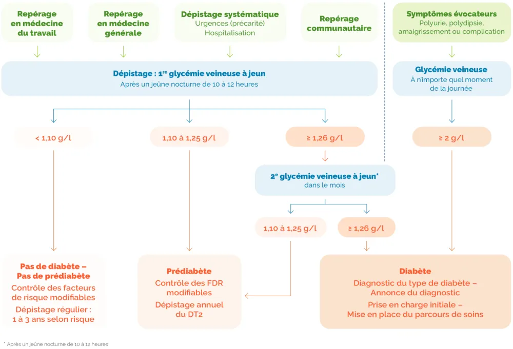 Le repérage précoce du diabète de type 2 est un enjeu majeur de santé publique. Identifier les personnes à risque, réaliser les tests de dépistage, annoncer le diagnostic et mettre en place rapidement une prise en charge adaptée constituent les étapes essentielles pour prévenir les complications et améliorer la qualité de vie des patients.